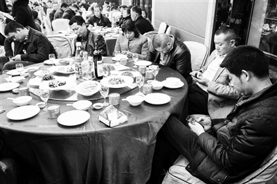 现在聚会中的饭桌上,传统习俗中的劝菜和品尝的场面不见了,更多的是吃饭的人将菜品拍照发至微信、微博等社交媒体的场景。很多人在整顿饭的时间里,都在不断摆弄着手机。也许是想看看网友对自己刚才发送内容的点评,也许是想看看其他朋友正在做什么。但这样的聚会表现产生的结果只有一个——身边的人受到了冷落、忽视。这样的场景,在家庭的聚会中也不陌生。手机在带来便利和效率之外,把亲情、友情割裂了。