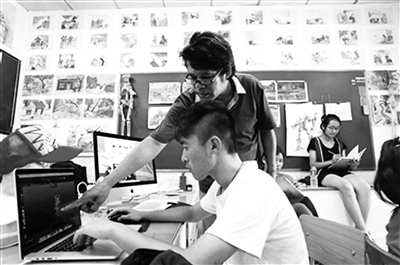 8月26日,位于大兴区的行知学校内,谷孝臣的十几名学生展示他们的画作。谷孝臣创立小农工工作室已有7年,义务教打工子弟画画。(9月10日《新京报》)
