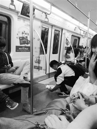 9月14日,少年在地铁车厢内主动蹲下来为陌生人收拾地上呕吐物的一组照片在微博中被热转,很多网友为少年的行为所感动。现场很多乘客表示,男孩只是默默收拾干净后,就到站下车了,没人知道他是谁,也没有人再见过他。(9月15日《沈阳晚报》)