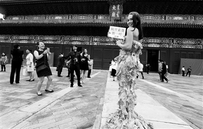 9月12日,由新梦想组委会主办、劳动人民文化宫等单位协办的第二届新梦想大会在北京太庙举行。大会以“What is the future”为主题,多位政府官员、企业领袖、学界专家和岗位精英通过自由演讲的形式,与大家共同分享了自己的经历、见解和思想,并畅谈了对于未来的设想。图为倡导绿色素食主义的志愿者身披蔬菜,表达自己的梦想。本报记者 白莹 于佳 摄影报道