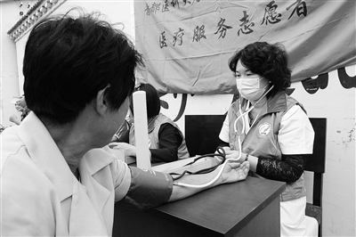 昨天上午,由通州区科协主办的“科普健康进乡村”系列活动走进毗邻河北廊坊的永乐店镇临沟屯村,由北京胸科医院多位主任医师带队的医疗志愿者服务队为百余乡村社区居民提供了义诊服务。在健康科普讲座环节,张旭主任医师用播放幻灯片的形式和通俗易懂的语言讲解了放射治疗的基本知识,介绍了吸烟和肺癌之间的关系,并规劝大家远离烟草。图为医学专家为社区居民提供医疗服务。