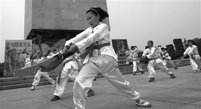 昨天,丰台卢沟桥一小、二小喜爱武术的同学,在抗日战争雕塑园内,听亲历七七事变的郑福来老人讲抗战时期宛平大刀队的故事,学大刀队的刀法。孩子们的武术指导老师介绍,成立这支宛平城地区少年大刀队,旨在弘扬爱国主义精神。本报记者 陈艺 摄影报道