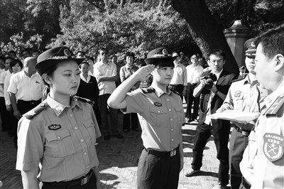 昨天,香山公园双清别墅20名职工穿上戎装,标志着北京市卫戍区高炮团香山双清别墅预编官兵班成立。今后,双清别墅全体职工将纳入部队预备役体系管理,统一着预备役军装上岗服务。换装后的双清别墅讲解服务工作将继承老一辈革命家的精神实质,以更高的标准做好对游客的宣传服务工作。本报记者 邱勇 摄影报道