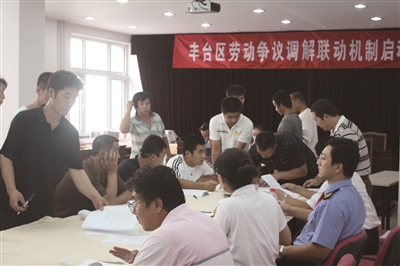 2009年7月31日,丰台区总工会正式启动由区总工会牵头,协同区人力社保局、区司法局、区信访办和区法院五家单位及律师事务所组成的“五方六家”联动劳动争议调解机制,为调解中心揭牌。劳动争议调解的成功与否离不开一支高素质、专业化的调解员队伍,8月10日,经过市、区总工会等相关单位的层层把关与考核,来自北京市东易律师事务所19名执业经验丰富的律师成为丰台区劳动争议调解中心的首批专业调解员,每天有两名律师事务所律师来调解中心参与调解工作。