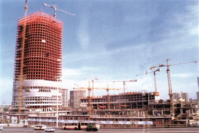 在1307个日夜后,1988年7月23日155米的高国贸大厦钢结构安装封顶;1989年10月,11万伏地下变电站竣工。