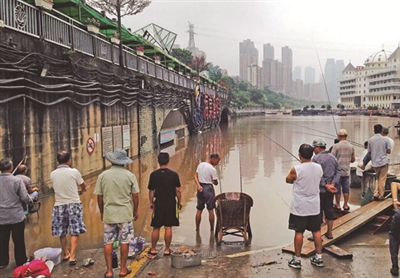 9月15日,重庆嘉陵江水位上涨明显,沙坪坝区磁器口古镇低洼处部分商铺和房屋被淹。从重庆市防汛抗旱指挥部办公室获悉,受上游强降水影响,长江、嘉陵江今年以来最大洪峰过境重庆。截至上午8时,长江寸滩水位179.37米,嘉陵江北碚水位192.39米,均未超警戒水位。重庆海棠溪码头已经被淹没,码头办公室和小卖部招牌露出在水面上。许多市民在被淹的码头公路上钓鱼。