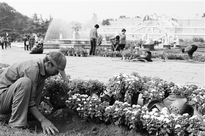 昨天,在世界公园,近百位园艺工人加班加点进行花卉的栽植、摆放工作。据悉,今年十一黄金周,世界公园为给游客营造一个优美的游园环境,将在园区设置大小花坛8个,栽种菊花、串红、海棠、大丽花、小丽花、三角梅、牵牛花等各种花卉总计8万余棵。届时,将给广大游客呈现出一个花团锦簇、花香四溢的芬芳世界。本报记者 陈艺 通讯员 赵彤 摄影报道