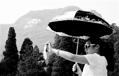 昨天,在西山八大处公园内,众多游客在雨中仰望虎峰山松涛间占地近万平方米的“祖国好”大型布雕。该艺术品的亮相,告知人们国庆即将来临,表达全园职工对新中国成立65周年的问候。本报记者 陈艺 摄影报道
