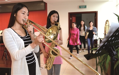 近日记者见到了这个管乐团的全部乐手。全团37个人中最小的只有19岁,最大的刚到30岁。京开分公司工会副主席周维均透露,2012年集团公司决定组建一支女子管乐团:“丰富职工业余生活,加强企业文化。当时就想办个冷门的,跟别人不一样。”乐团团长、29岁的付艳娜是杜家坎收费班的班长,她回忆说:“报名的近百号人中,都是零基础。从外面请了老师,他挨个看看大家嘴型,分配每人一件乐器。”之前她连这些乐器长什么样都不知道:“甭管使多大力气,根本吹不出音。就天天拿个号嘴琢磨,吃饭回宿舍的路上也在练,一周后才吹出了音。3个月后我们学会了曲子,毕竟成调了,大家都很兴奋。”