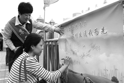 9月16日,公交客五分公司在北京站东街站台开展“绿色出行共参与,文明交通我为先” 宣传活动。为了到达良好的宣传效果,此次活动将地点设在客流相对集中的北京站东街,活动中来自公交的十余名绿色出行倡导者,身着整齐的公交制服,利用横幅、宣传材料以及言传的形式向来往的乘客宣传绿色出行并邀请来往乘客联名倡导。图为一名乘客在签名参与倡导。通讯员 刘蕊 摄影报道