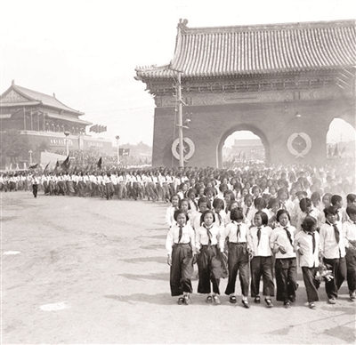 国庆1周年少儿队伍在长安街 1950年10月1日,首都各界40余万人在天安门广场举行庆祝中华人民共和国成立一周年大会。图为少年儿童的游行队伍行进在长安街。当时天安门东西两侧的长安左门和长安右门还赫然屹立。 |