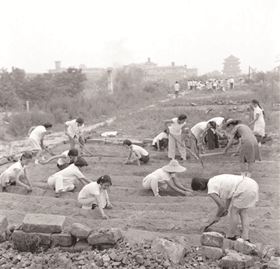 工人在城墙上播种秋菜 1960年,北京新开路缝纫厂、南官房皮件厂等街道工厂的工人,利用假日在崇文门附近的城墙上开地播种萝卜等秋菜。 |