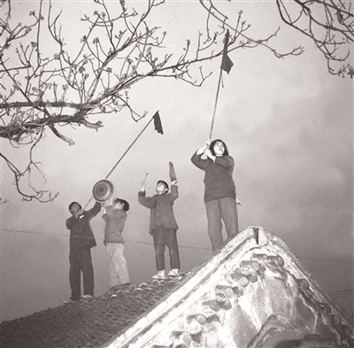 除四害时麻雀被“冤枉” 1958年4月19日,北京围剿“四害”,苍蝇、蚊子、老鼠和麻雀。麻雀是益鸟,被“冤枉”了。后来被“平反”,代替它的是臭虫和蟑螂。这是北京市民在夜间上房顶轰赶麻雀。 |