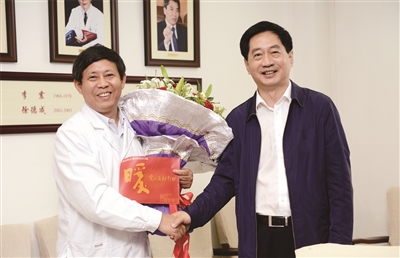 图为梁伟到北京阜外心血管病医院看望全国劳动模范、著名心血管病专家周宪梁。