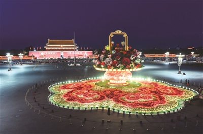 昨天晚上,天安门广场中心大型花坛“祝福祖国”点起节日的彩灯。名为“祝福祖国”的中心大型花坛以花篮为主景,篮中插有牡丹、玉兰、芙蓉、月季等花材,平面部分由如意图案的花卉组成,寓意富贵吉祥、平安幸福。花篮篮体表面嵌有中国结图案和中国梦文字。花坛直径50米,花篮最宽处15米,顶高15米。