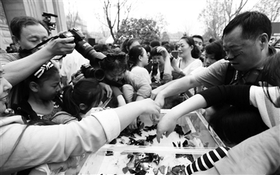 9月27日,河南新乡,市民在科普展上哄抢放飞的蝴蝶。当日,河南新乡市在境内黄河湿地举行首届凤湖蝴蝶科普展,展出来自世界近百个品种的万只珍贵蝴蝶及标本,展后,现场放飞万只蝴蝶。然而,蝴蝶刚一放飞就遭到现场市民的哄抢捕捉,就连主办方在蝴蝶园里展示的蝴蝶也被抢。(9月28日中新网)
