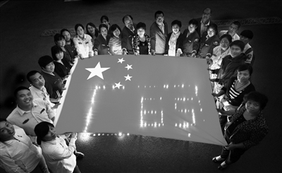 点燃码好的红烛,捧起鲜艳的国旗,追思逝去的先烈,祝愿祖国更加繁荣昌盛。28日傍晚,公交特9路车队与黄土岗村大队党支部职工一起,以自己的方式迎接建国65周年的到来。点燃的烛光映衬在国旗上,表达着职工对当下幸福生活的珍惜。本报记者 于佳 摄影报道