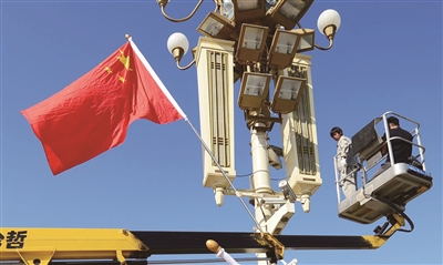 今年国庆期间,天安门城楼前的华灯首次为迎国庆悬挂国旗。长安街东单至西单的157根华灯灯杆上都悬挂了五星红旗。