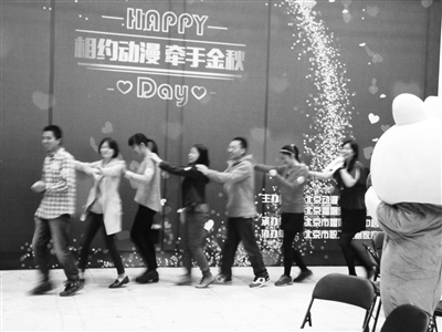 10月2日,既是“重阳节”,又是国庆节的假期。这一天,国家会议中心异常热闹,在举办动漫游戏嘉年华活动的同时,正在进行着主题为“相约金秋,牵手动漫”的单身青老年交友活动。在现场,记者看到卡通动物熊小米和艾莉也到场为单身青老年牵线。许多单身青老年留下了“寻爱墙”上的信息,为进一步相识打下基础。据北京市职工婚姻家庭建设协会秘书长夏华云介绍,此次活动还采用了新媒体的线上和线下互动,创新了交友的方式。