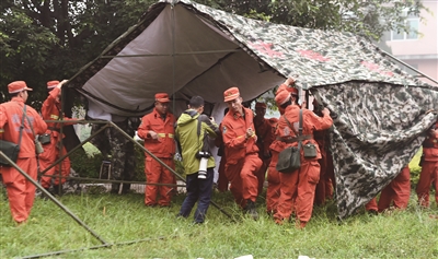10月8日,武警森林部队救援人员在震中永平镇搭建帐篷。云南景谷地震发生后,各救援力量紧急赶赴灾区开展救援。先期到达的武警普洱支队、临沧支队以及消防部队、成都军区救援官兵完成了景谷县城至永平镇道路的清障工作,并分别在永平镇芒腊、迁云、那拐、芒费等行政村搜救、疏散群众,搭建帐篷,转运伤员。(新华)