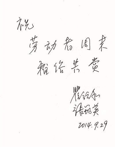 张筠英说:“想一想我的童年,真是无忧无虑,幸福的生活。再看看现在的孩子,被学习压得很累,基本上没有自己的空间,整天忙于学习各种知识。这样一对比,我们的童年是幸福的。”说完,张筠英为《劳动者周末》题写了“祝劳动者周末雅俗共赏”的寄语。