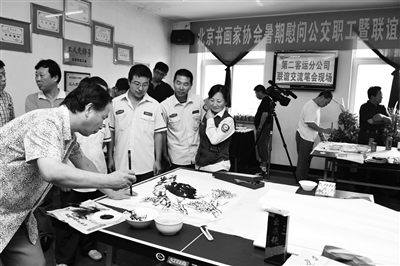 近日,北京书画家协会的狄连仲、孙大兴、马良田、牛生正、裴友来、孙勤、金克强七位画家来到公交客二分公司631路车队,与爱好书画的公交职工共同探讨书画技艺。通讯员 宋哲 摄影报道