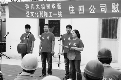 日前,住总四公司工会特意为海淀上庄项目部“私人定制”了一场慰问演出。此次演出共分为合唱、独唱、配乐诗朗诵、三句半、反串、京剧、舞蹈、乐器演奏等8种不同的节目形式。其中,由住四公司各项目部、分公司和公司机关的近30名演员表演的配乐诗朗诵《献给亲爱的祖国》、三句半、京剧《甘露寺》以及来自外施队朋友带来的民族歌曲《说句心里话》、《在那桃花盛开的地方》,唱出了在场每个人对美好生活的追求和渴望。通讯员 高飞 孔健 摄影报道