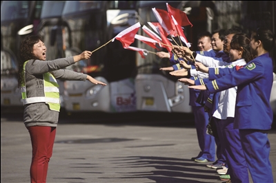 抬手是“这里”,挥手是“过来”……昨天,公交特9路车队邀请文明监督引导员,为新司机和新售票员进行旗语培训。旗语是站台引导员指挥公交车进站的语言,为使新司售尽快熟悉旗语,车队特意组织职工定期培训。