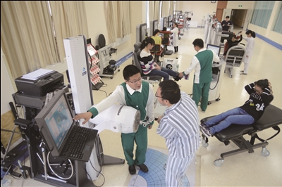 | 首席康复治疗师、运动疗法1科神经康复治疗师长刘畅(右一),她正在为偏瘫患者纠正步态和不良姿势,她主攻神经康复和心肺康复方向的研究与治疗,针对脑卒中、颅脑损伤、脊髓损伤等神经系统疾患,运用世界最先进的神经康复技术进行康复训练。 |
