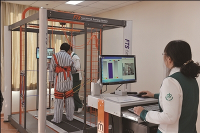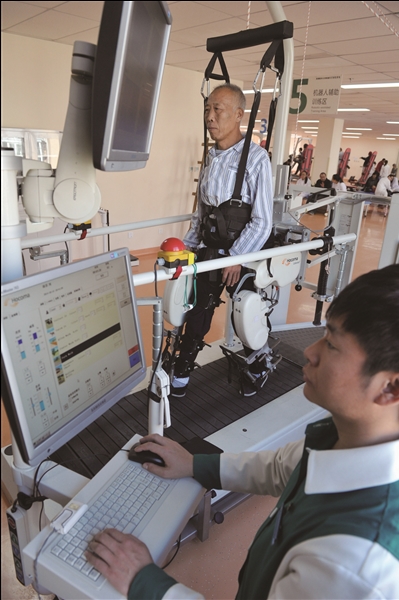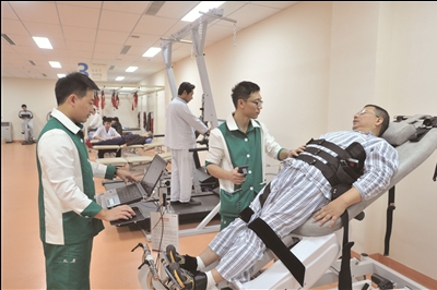 | 运动疗法1科、脊髓损伤治疗师长王寒明应用下肢康复机器人指导患者进行步行训练,他专攻脊髓损伤康复治疗技术,使许多不完全性脊髓损伤患者重新获得步行能力。 |