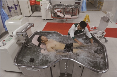 | 水疗科治疗师长赵岳正在为下肢瘫痪患者进行涡流气泡浴治疗,他在水中康复治疗研究方面,将运动治疗(PT)与水的特性相结合,采用“一对一”的个体化训练模式,帮助很多患者恢复生活能力和劳动能力。 |