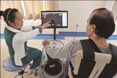 | 作业疗法科治疗师长张晓颖在应用上肢康复机器人进行上肢功能恢复性训练,她长期从事作业治疗工作,主要从事偏瘫、脊髓损伤、骨关节疾病及周围神经损伤等方面的作业评定与治疗,重点在家庭环境改造、指导患者适应家庭及社区生活等方面积累了丰富经验。 |