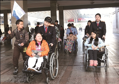 北京瓷娃娃罕见病关爱中心上周组织20多名“瓷娃娃”乘车到大连参加活动。北京站售票值班员杨爱今、韩昊得知情况后,热情帮助他们换取网购车票,并联系客运车间素萍服务组,开辟绿色通道,将20多名行动不便的“瓷娃娃”送上D41次列车。