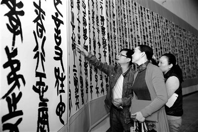 近日,有着“中国篆书第一人”称号的著名书法家王友谊,在京举办个人篆书艺术展。谈及自己用大篆所书写的《孝经》时,王友谊说:“《孝经》是中国古代儒家的伦理学著作,融汇着传统的孝道、和谐内涵,值得人们系统学习思考。” 本报记者 马超 摄影报道