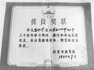 中学的学习课程比较多,我的父母没有什么文化,学习全靠自己努力。那时,我常在日坛公园看书复习功课。在日坛公园圆坛西门南侧,有一棵上千年的九龙柏,在离地1米多高的大树杈上,能容二三个人站立,我常在上面背靠树杈看书。在老师们的帮助下,我努力学习各门功课,初一至初三,每年都获得了优良奖状;另外,我还获得了初中三个学年的优良奖状。这些小奖状,我至今还收藏着。