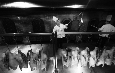 “烤制过程中不见明火,烤出鸭子外酥里嫩,口味鲜美,咱们必须掌握这些要领……”业务练兵与生产经营两不误,北京著名的“中华老字号”饭庄便宜坊烤鸭店近日开展全集团范围的岗位练兵。成熟的烤鸭师傅在时间、火候标准的情况下,比烤鸭口味、口感,技法掌握的熟练程度。本报记者 边磊 于佳 摄影报道