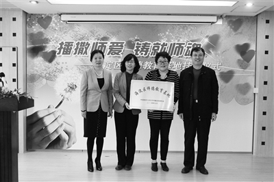 继海淀区实验四小之后,海淀区第二个师德教育基地日前在海淀区培智中心学校挂牌,该校是海淀区唯一对智障学生实施九年一贯制义务教育的特殊学校。区教育工会刘振杰主席和刘文英副主席为基地挂牌,老师们在师德寄语爱心牌上写下师德感言并签名。