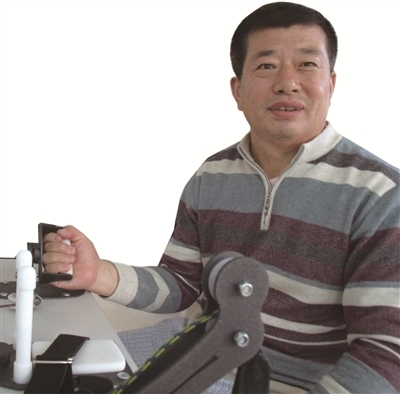 高印启做完右手练习后,张玉庭又拿来了一个皮球与高印启进行传递球的练习。只见高印启站着用还不自如的右手接过张玉庭投来的皮球,双手再使劲投给张玉庭。高印启说:“以前,我没病的时候,像这样的皮球,右手就能够抓住,扔过去,不费吹灰之力。现在,一只右手再加上左手再扔过去都费劲。刚来的时候,右手就废了。”练完传递球,高印启又来到一台训练器前进行练习。这是一台综合训练器,主要是训练上肢活动。高印启右手握着一个训练设备对记者说:“你看,我右手有劲吧。”