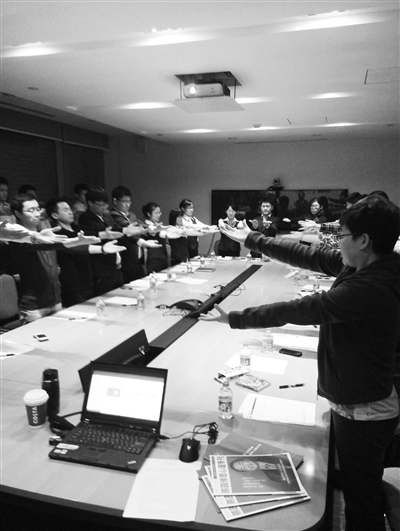 在老师的鼓励下,进行了第一次尝试,但由于任务的理解、执行过程出现问题而以失败告终。失败之后,大家各自总结经验,互相打气,决定再试一次,经过整个团队的互相配合,不到20秒就恢复了之前的圆圈。成功的完成任务后,所有的员工都激动地击掌庆祝。