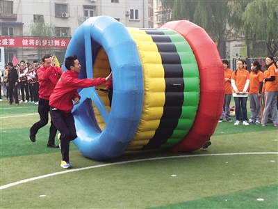 在毛毛虫的比赛场地前,还没等裁判员宣读比赛规则,已经有4名女职工看到造型可爱的毛毛虫忍不住坐上去开始练习了。动感五环比赛的器材同样吸引眼球,一个空心的大红气球内可以站立一名队员,另外四名队员在球外掌控方向,和球内的一名队员共同努力将球向前行进30米,随后换另一名队员入内继续前进。为了取得胜利,好几支队伍中在球外掌控方向的队员们,都成了让球前进的主要力量,他们用尽全身力气推球,球向前飞速前进,球内的队员来不及倒退,只得在球内随之翻滚,现场笑声一片。