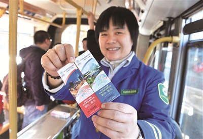 昨天,北京市公交集团发行一套“APEC会议”纪念车票,共2张,每张票价1元。纪念车票与日常公交车普票购买方法一致,乘客上车时按照所乘线路现行票制票价购票,当日当次乘车有效。图为一名公交售票员展示“APEC会议”公交纪念车票。