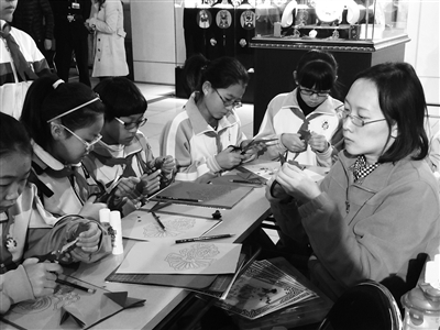 年画、兔爷、剪纸、版画、软陶、篆刻、脸谱彩绘……垂杨柳学区举办的第六届师生收藏主题教育活动近日举办,工艺美术专业的老师带领学生们制作7个传统项目的手工艺品。活动还邀请了社区居民参加,在专业老师的指导下进行传统手工艺制作。本报记者 孙艳 摄影报道