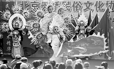 昨天,在天桥剧场广场,天桥老艺人传人曹群来为市民表演“八头变脸”的传统绝技。当日,天桥民俗文化协会揭牌。回归天桥故土的老艺人“坛子周”、“飞叉赵”与新一代艺人同台献艺,让围观的市民大饱眼福。本报记者 陈艺 摄影报道