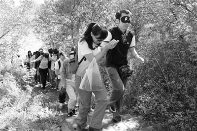 “我的同伴在刚才的信任之旅中,能够用不同的肢体动作提示我该迈大步还是小步,有台阶还是没台阶,我们非常顺利就上到了山顶!”一位戴着黑框眼镜的年轻小伙羞涩地对记者说,“我觉得我的同伴是一位非常细心,又很聪明的女孩儿。”