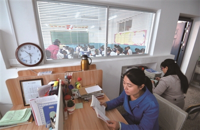 近日,河北省邯郸市广泰中学实行“教师全程随班办公”模式,通过“一拖二”的办公室与教室的特殊改造,学校每个教室后部设有班主任办公室,班主任通过办公室窗户能够零距离随时观察每位学生,在办公室随时掌握班级动态,全面了解学生学习兴趣、听课状态、自学习惯等。