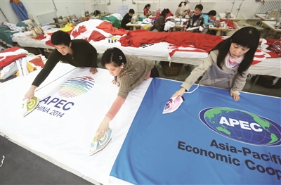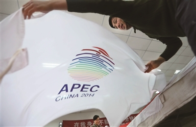白志跃经理告诉记者:“我们厂子10月底接到制作APEC用旗的订单,从10月26日开始制作,七八十名职工克服困难,经过10天的紧张赶制,3000面APEC用旗如期交付使用。回想起来,像是经历了一场小战役。”