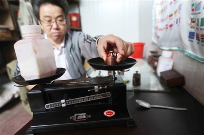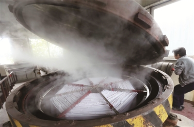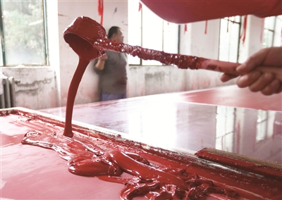 杨师傅在京工红旗厂做了20多年的印染工作,除了吃午饭,每天都要在温度这么高的车间里工作8个小时,有时还需要加班加点。不过,杨师傅很喜欢自己的工作,“每次在天安门看到自己亲手参与制作的国旗,都觉得特自豪!”杨师傅一边说,一遍手拿刮板仔细地刮着各种颜色的颜料,身上被染料弄花的白色T恤早已被汗水浸透。