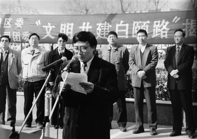 翻阅这张十七年前的老照片,站在前排发言的就是我。站在我身后的有团市委、海淀区和市政工程总公司的领导,主持“文明共建白颐路”活动揭幕仪式的是海淀区团委书记苗立峰。