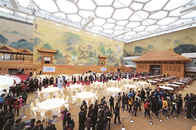 2014年APEC会议欢迎晚宴举办地水立方,于11月22日重新对公众开放,让市民近距离体验APEC全貌。当日,国家游泳中心“水立方”正式开启“上善若水APEC之旅”,游客可以近距离饱览APEC欢迎晚宴场地原貌。“上善若水APEC之旅”初步计划从22日起开放两个月。图为游客在宴会大厅内参观游览。