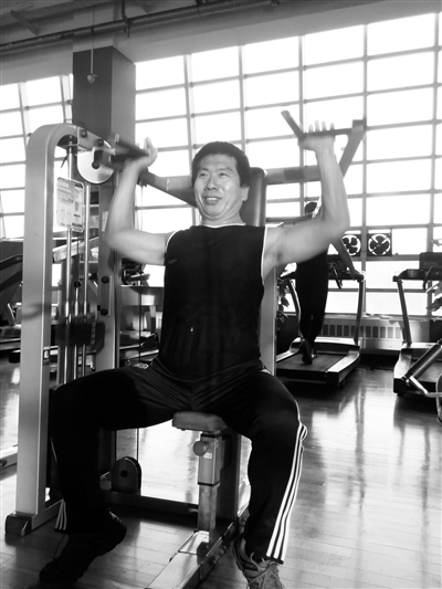 记者从田径场出来,走进了丰台工人俱乐部三层的浩沙健身房,看到一肌肉结实、身体壮硕、正在运动的中年男人,便走过去询问。